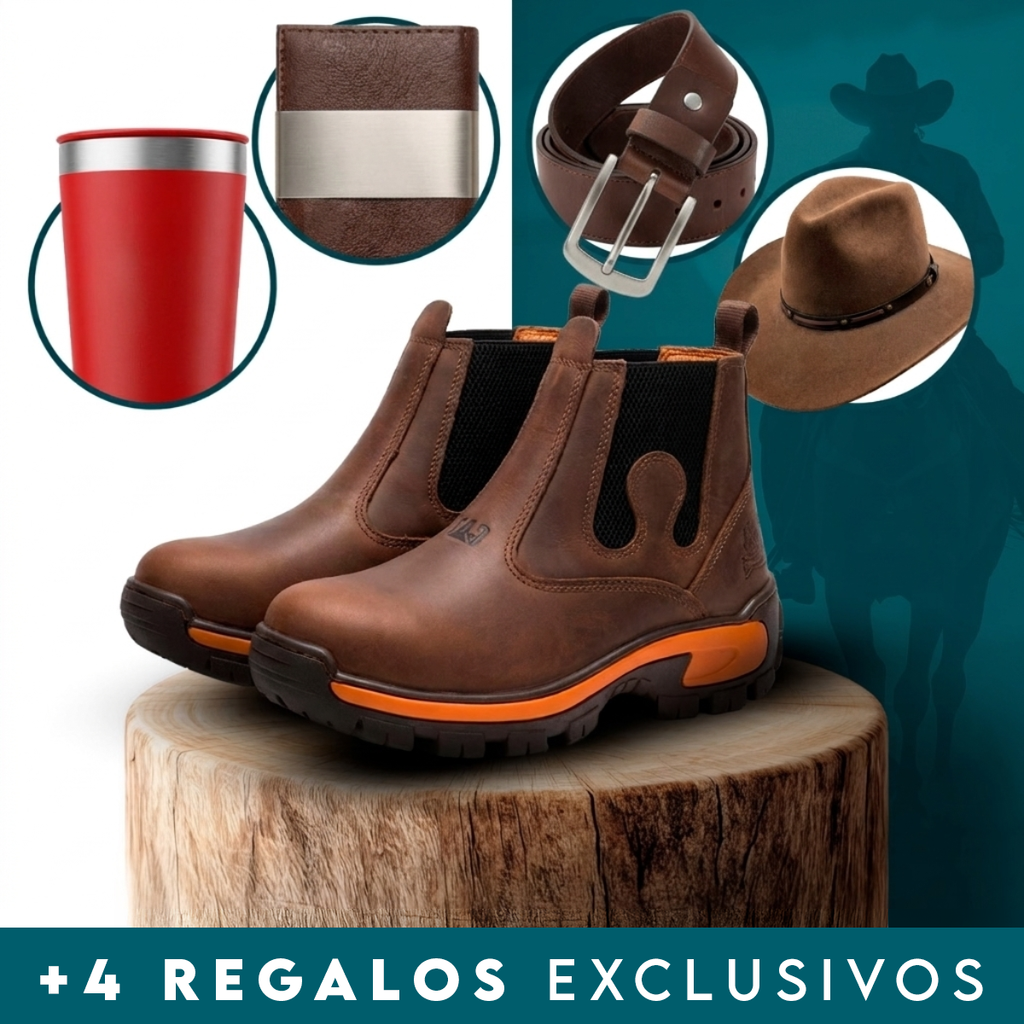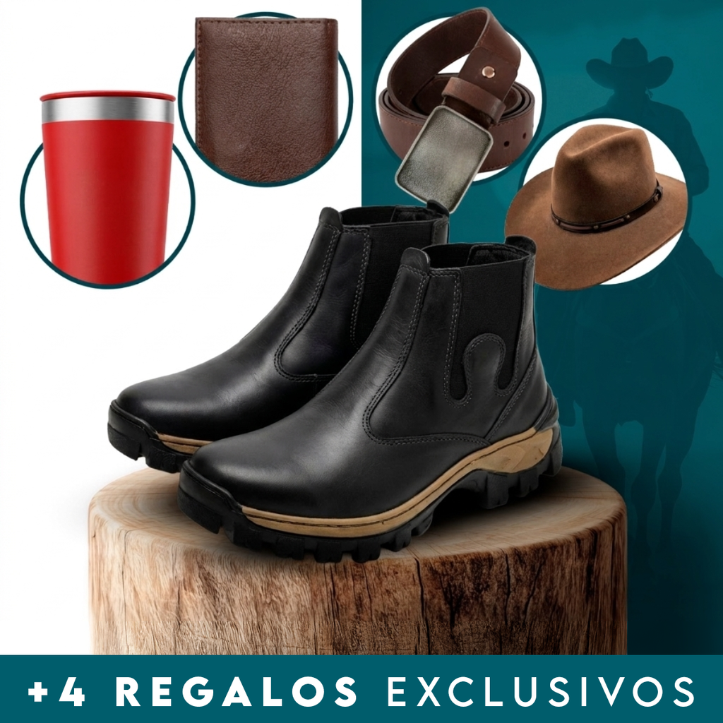 Es ese tipo de bota que te cambia la postura: se ve fuerte, se siente firme y levanta cualquier outfit. La usás con jean, cargo o ropa de trabajo y ya estás listo. Y con los 4 regalos cerrás el combo perfecto para salir con estilo sin tener que comprar todo por separado.
